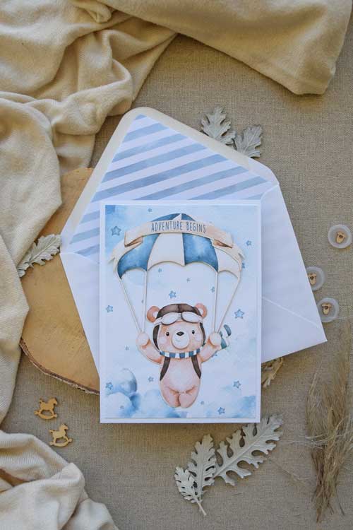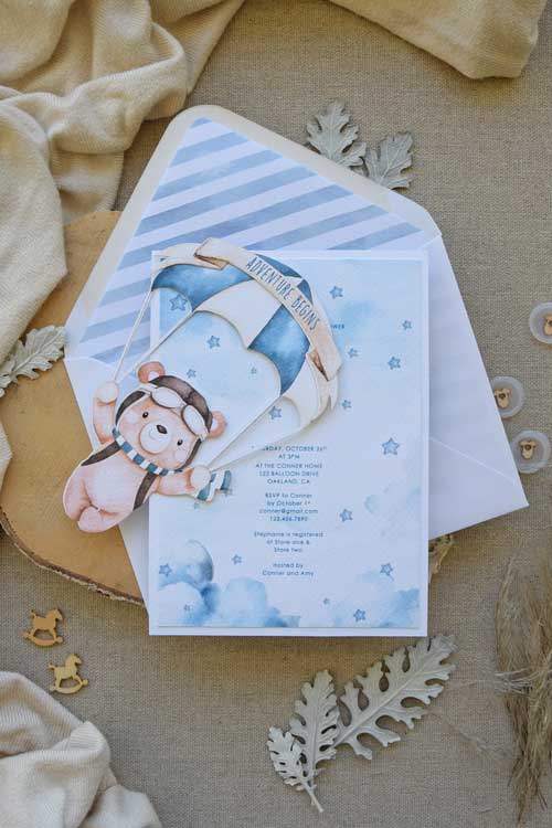 • Customized Invitation card printed on both sides on white paper + laser cut air balloon that rotates to show the important info