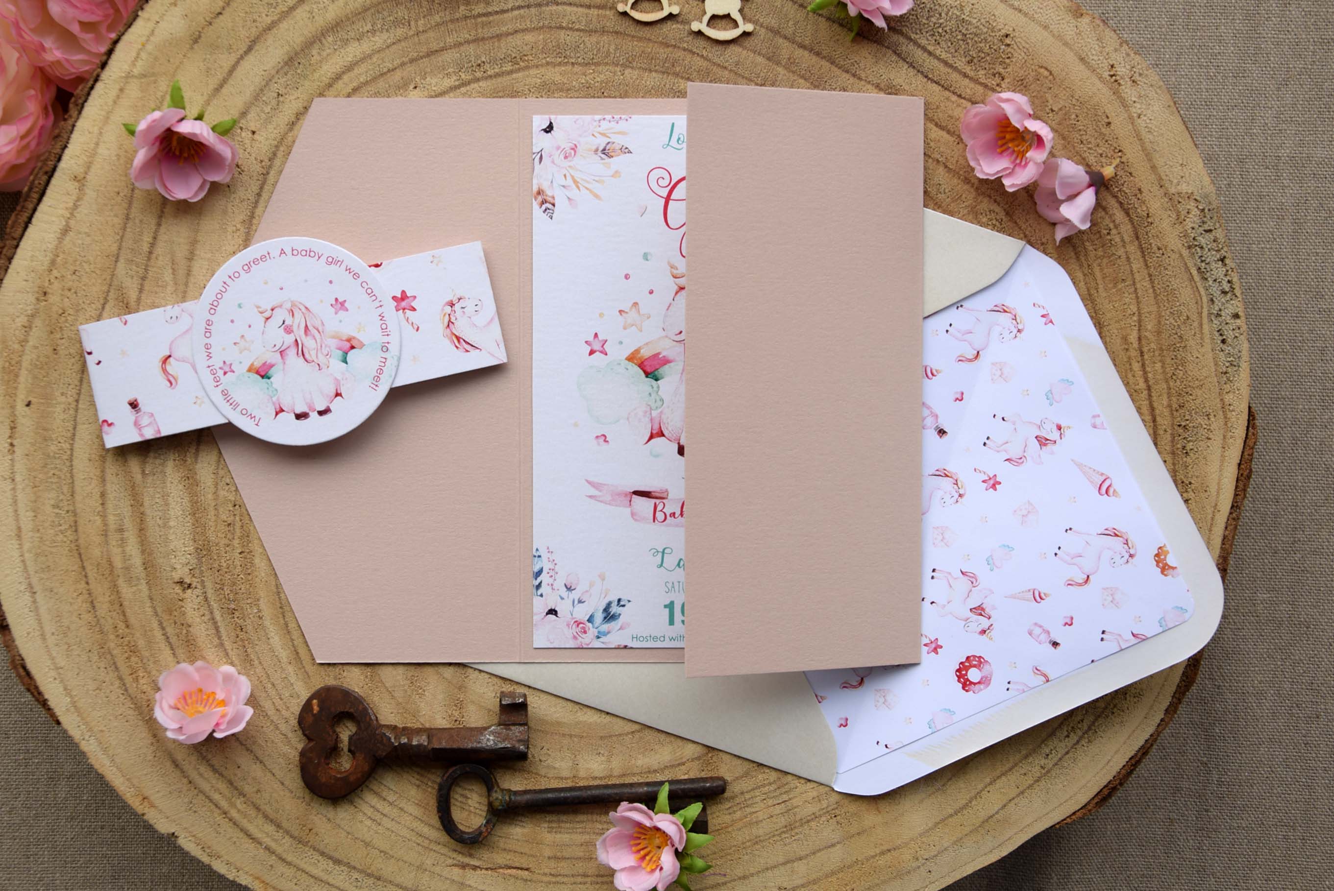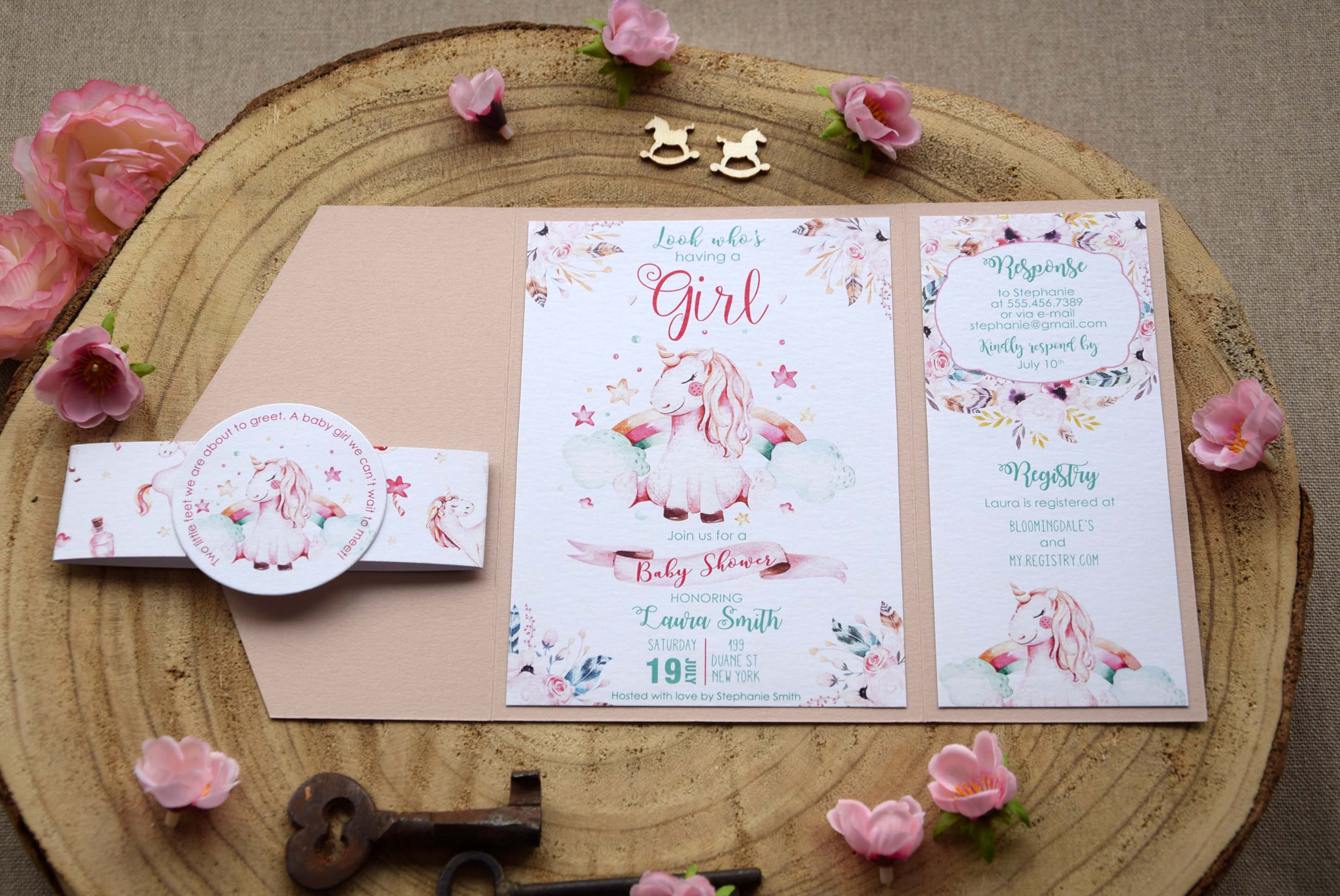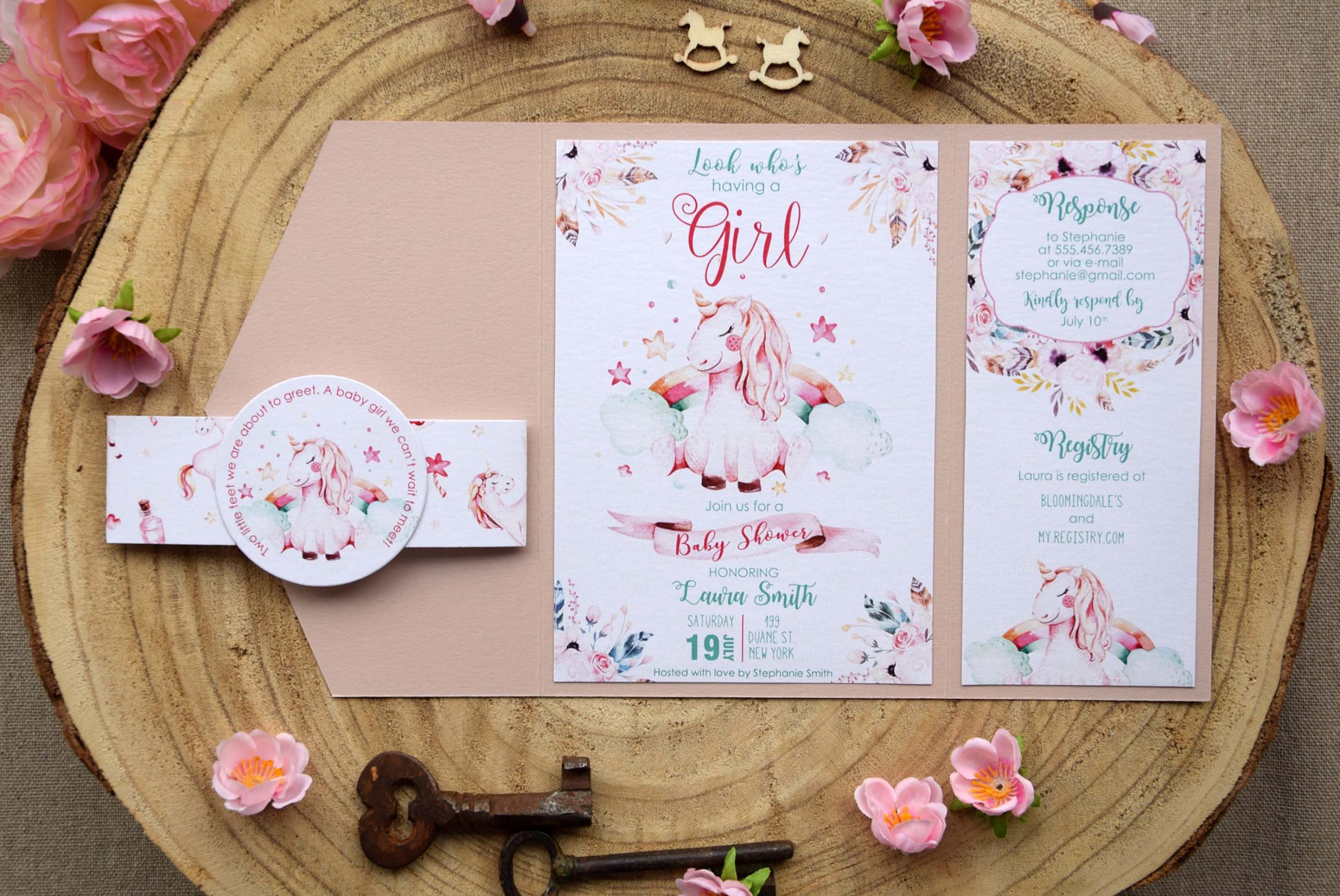 Celebrate the upcoming arrival of a new life with our baby shower invitation inspired by the meaning of unicorn symbolism.