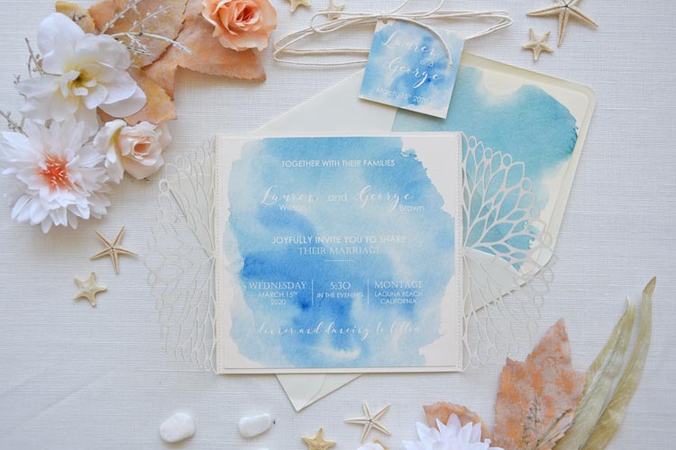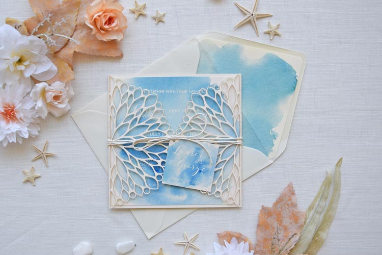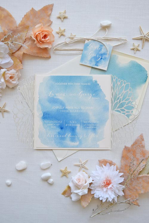 Laser Cut Wedding Invitations for Beach Wedding inspired by beach weddings and perfect for a seaside ceremony. The blue and ivory are inspired by the sea, and this set’s perfect for a seaside ceremony. The laser-cut pocket fold and cards have a shimmery look for an elegant and beach-themed wedding.