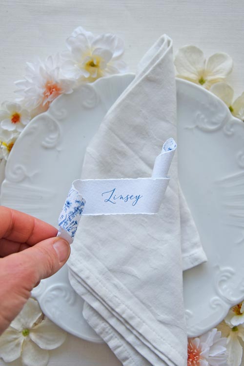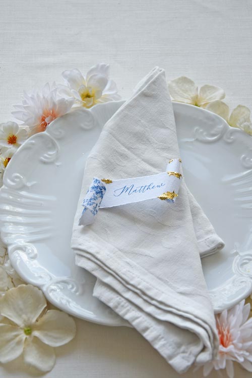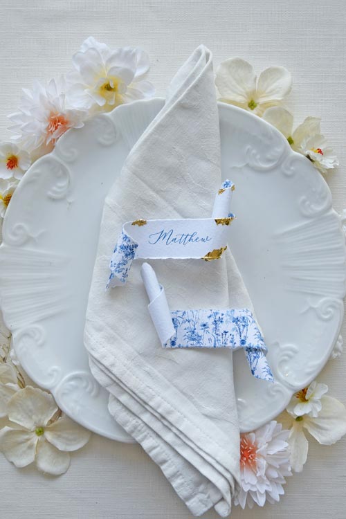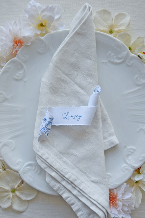 Hand-rolled to resemble an antique scroll and adorned with soft blue wildflower illustrations, this design adds a romantic flourish to any table setting.