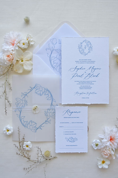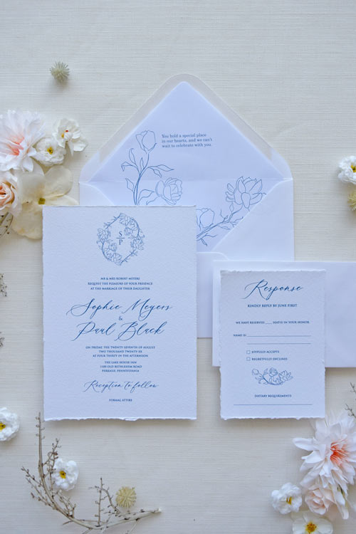 - Invitation Card printed on softly textured white cardstock with deckled edges – the invitation features an elegant serif and calligraphy typeface in dusty blue ink. The top is adorned with a custom floral crest — a timeless frame for your initials.