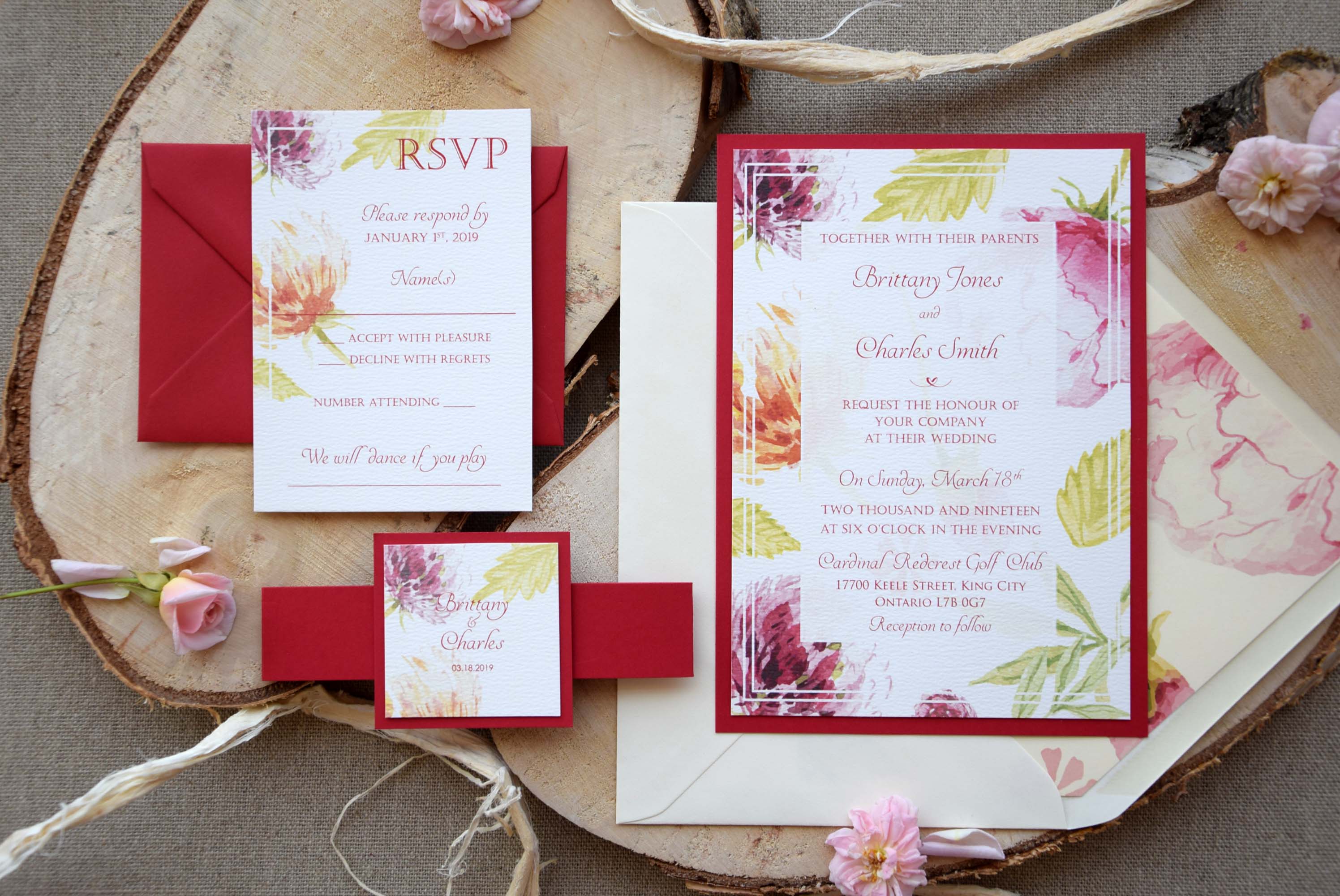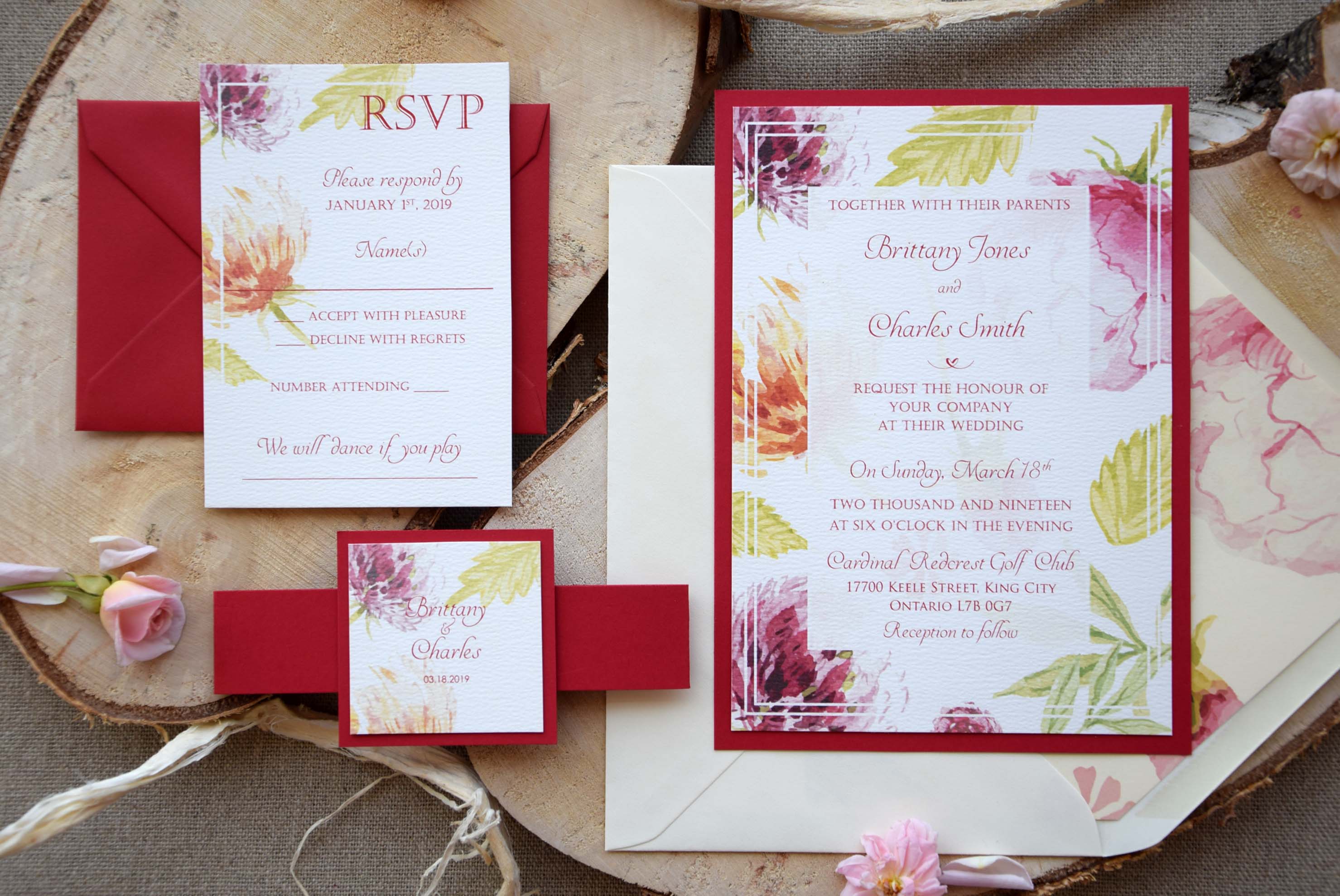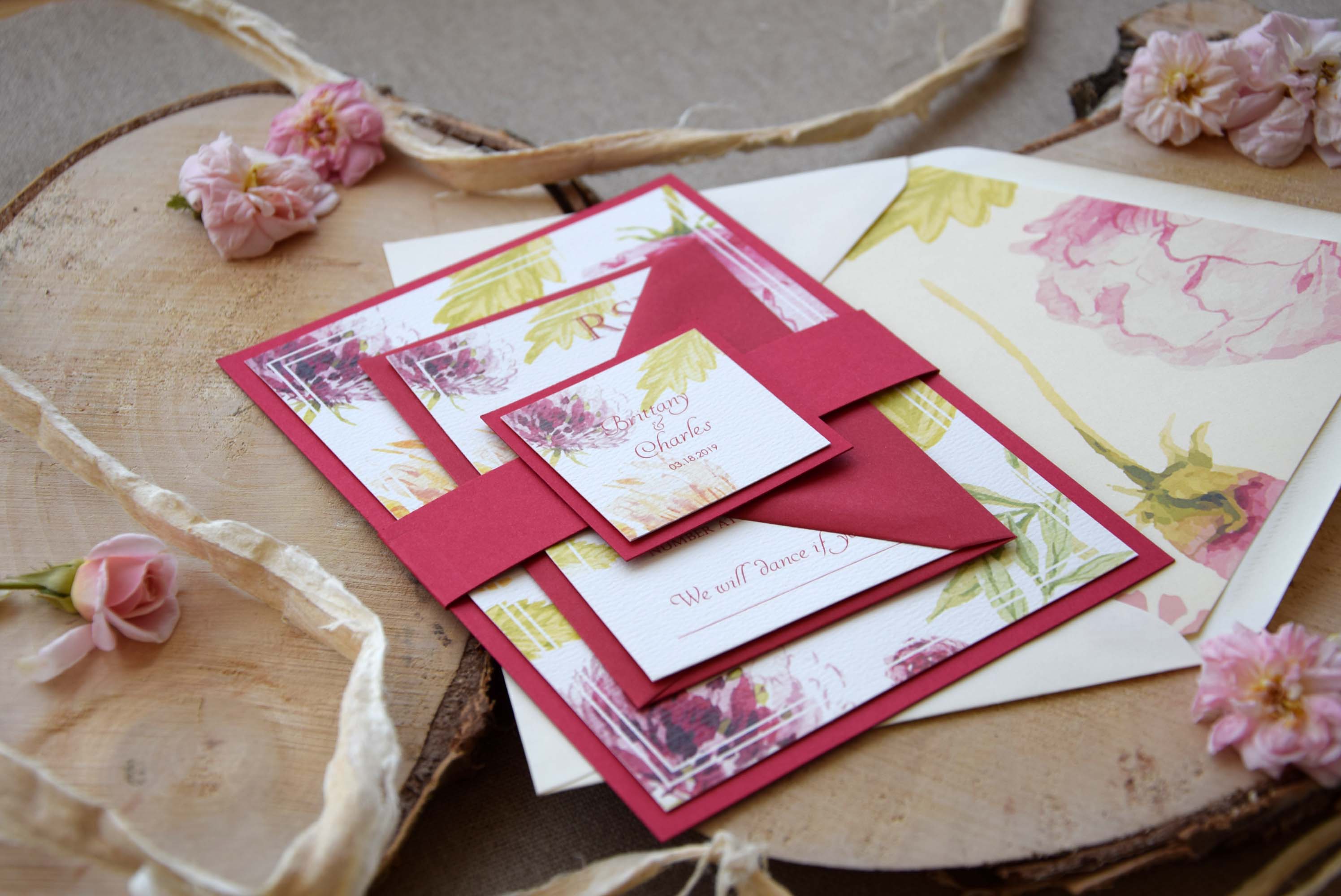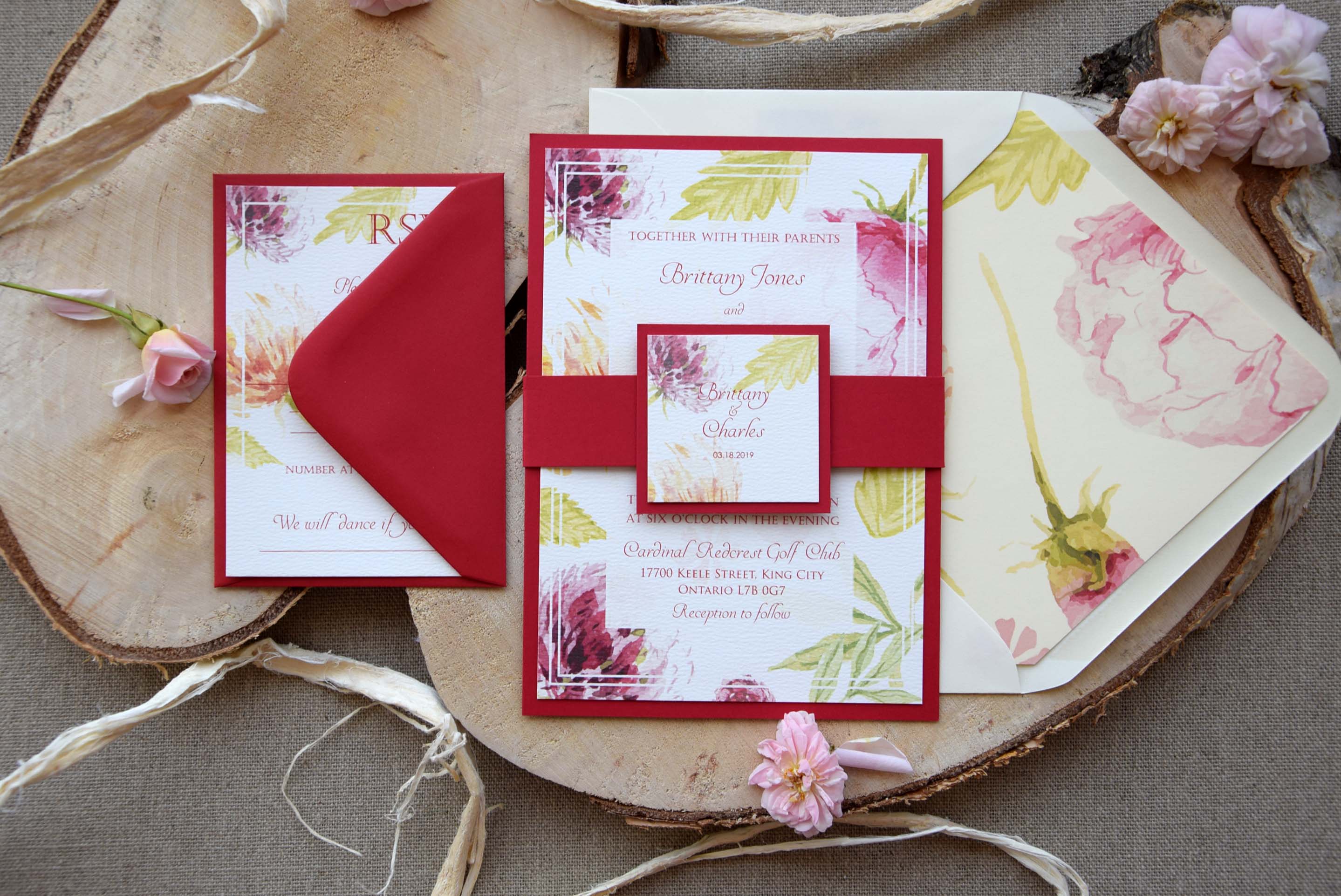 Each set is paired with off-white and burgundy, burgundy and cream envelopes with liner envelope included and belly band with names and date. These lovelies details will impress your guests!