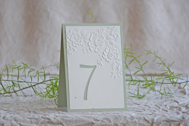 Its clean numeral stands out clearly for guests, while the floral embossing introduces a romantic detail that ties beautifully into garden weddings, fine art tablescapes, and elegant celebrations with a soft, natural palette.