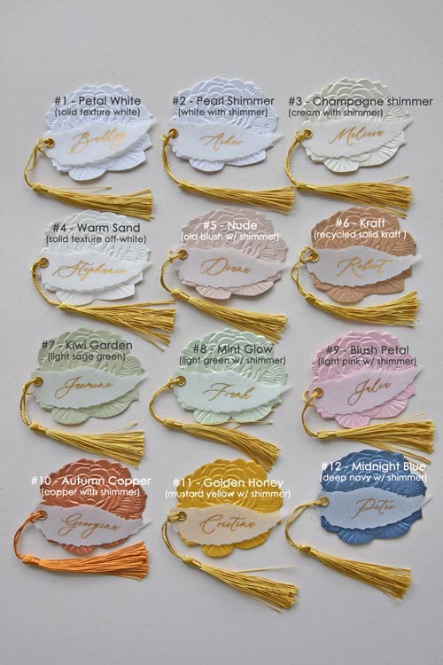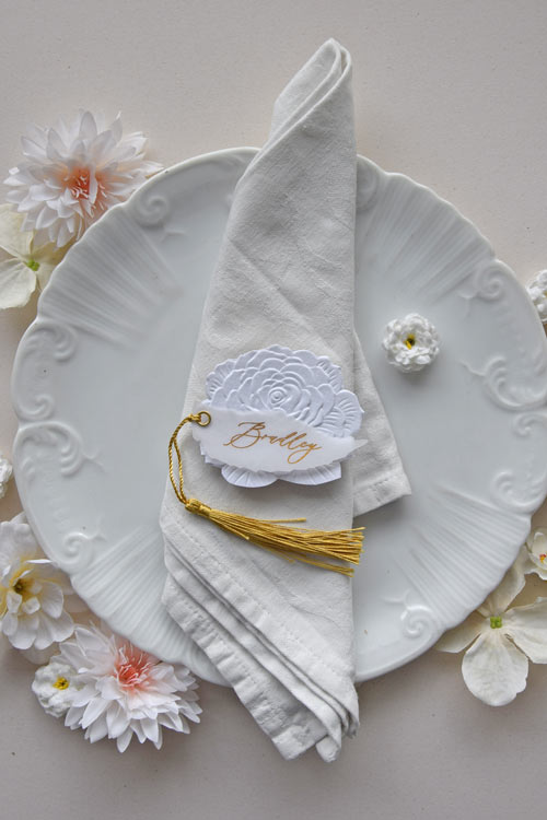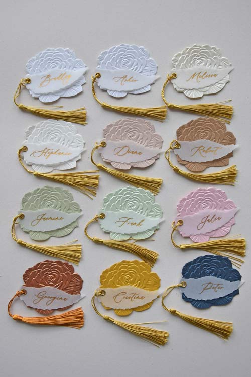 Shaped with soft floral curves and embossed with delicate camellia-inspired detail, each card is finished with the guest’s name in foil and paired with a tassel for an elegant final touch.