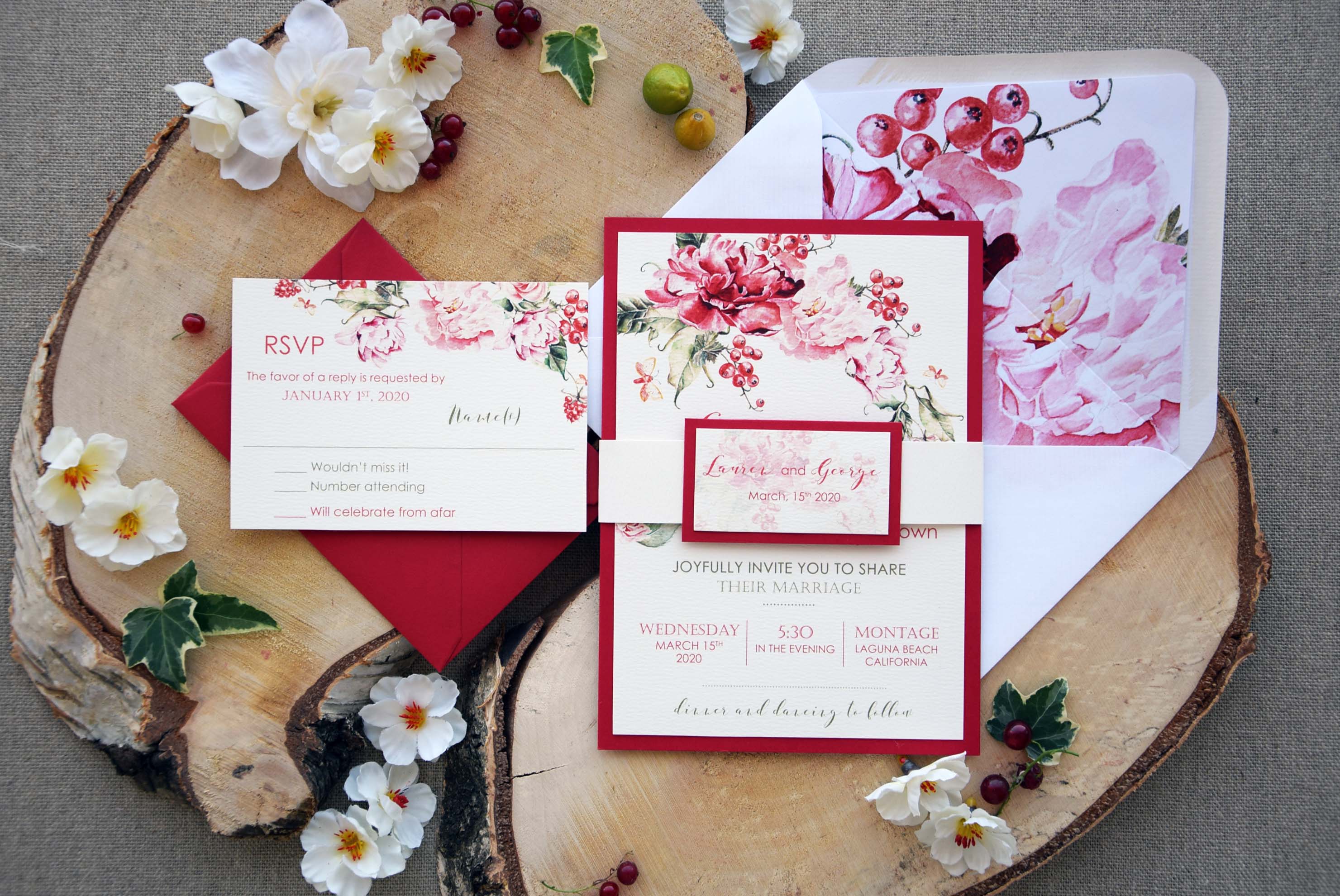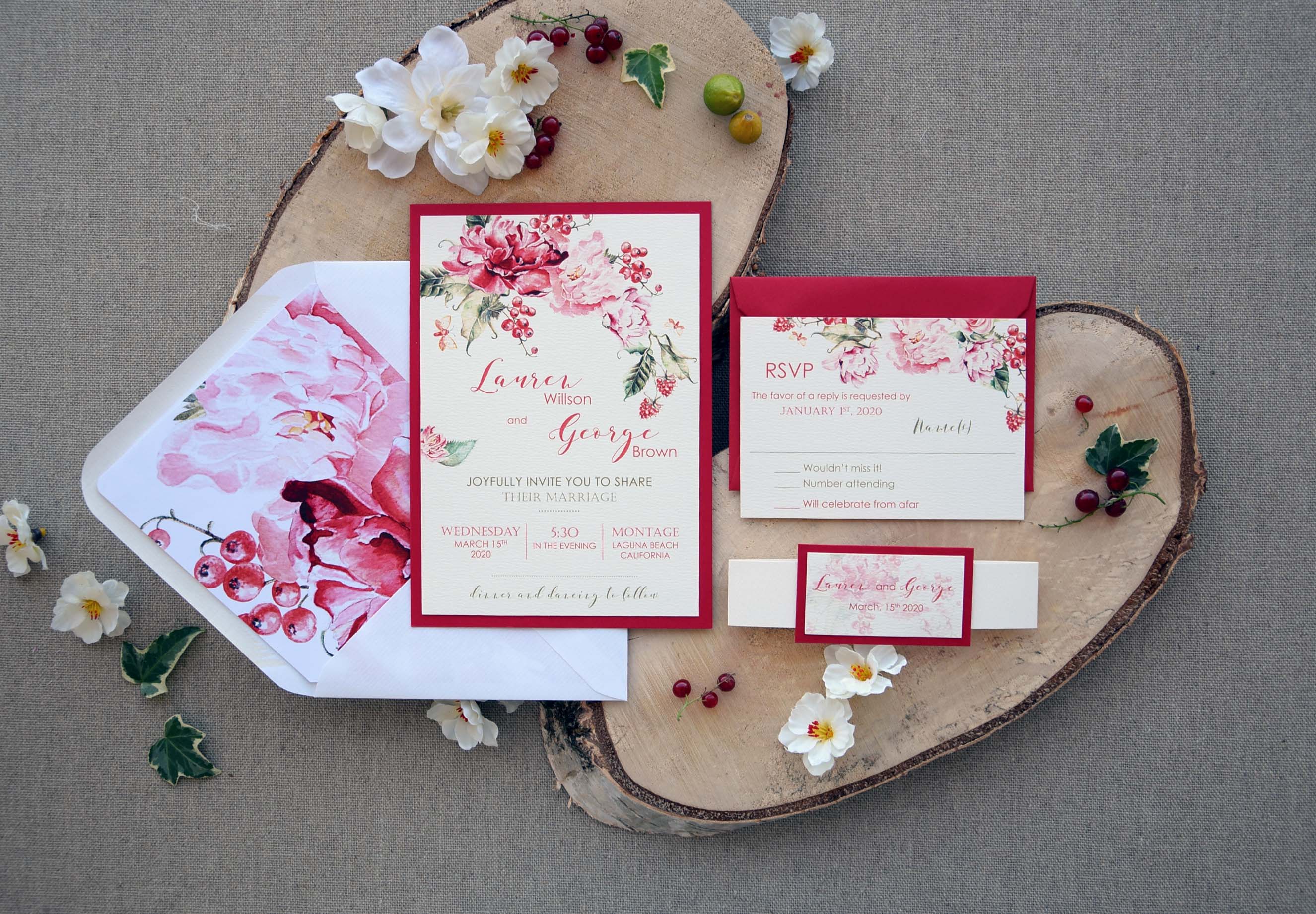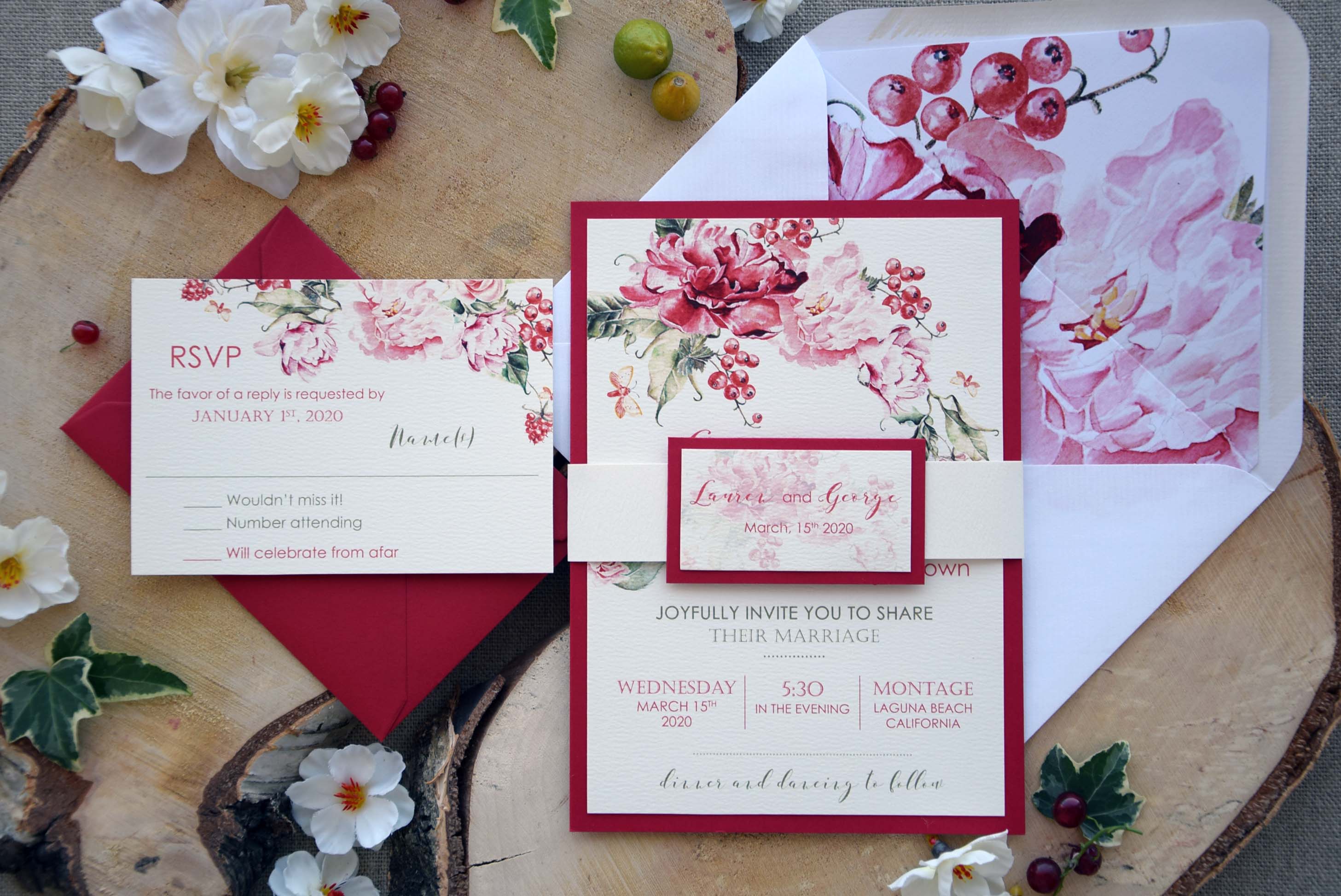 Each set is paired with off-white and burgundy, burgundy and white envelope with liner envelope included and belly band with names and date. These lovelies details will impress your guests!