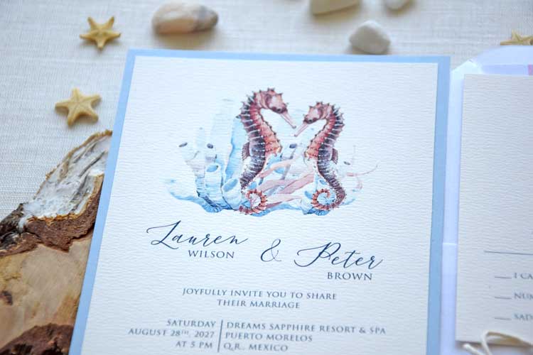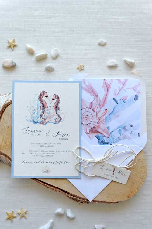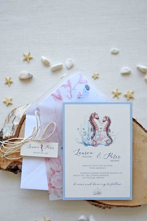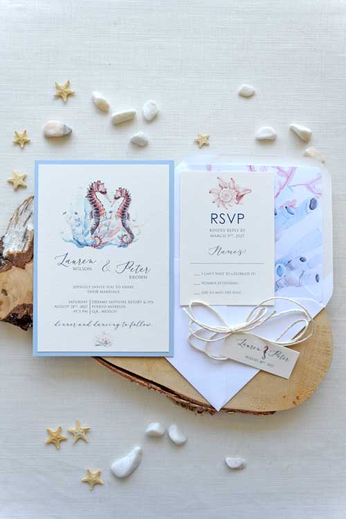 Inspired by the serenity of sandy beaches, shells, sea horses, and gentle ocean waves, these invitations are designed to capture the essence of your coastal love story.