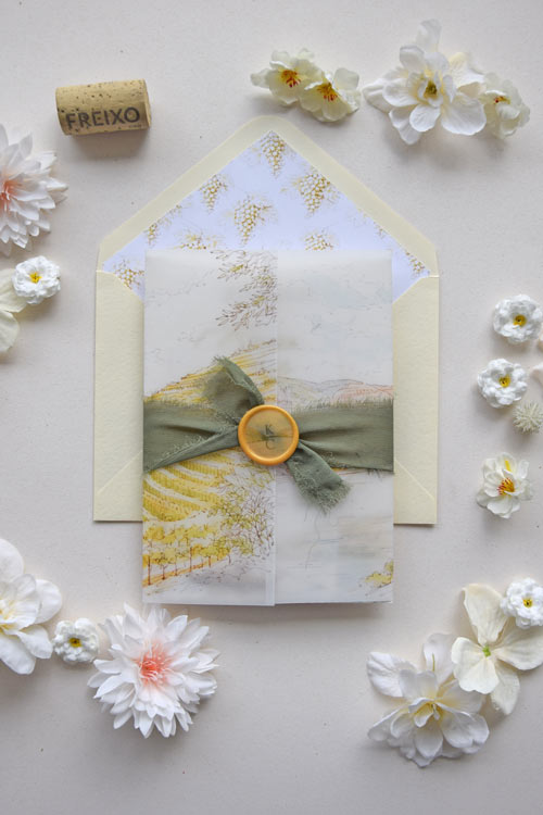 • Vellum wrap illustrated with vineyard scenery, bringing the suite together with a layered, artistic look