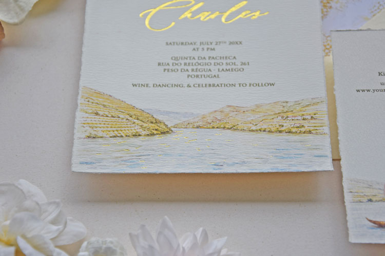• Printed in green ink with the couple’s names in gold foil, and illustrated Douro Valley vineyard landscape at the bottom