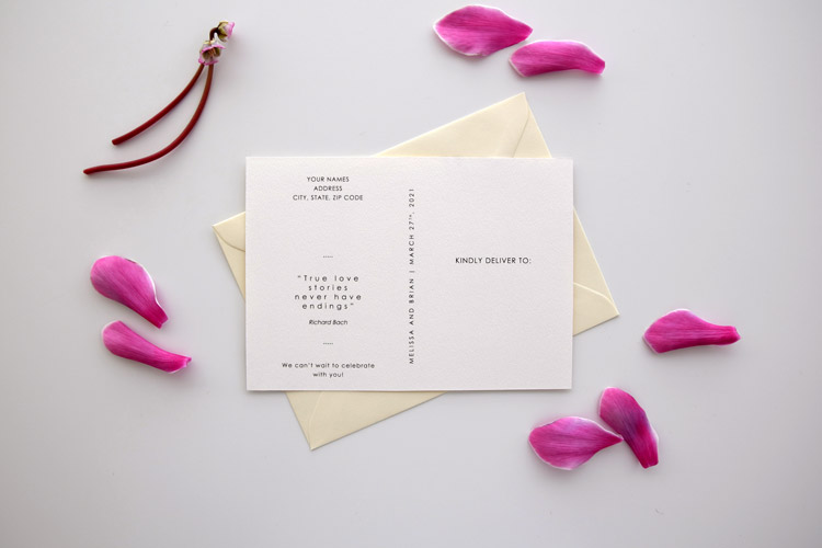 - Postcard: printed on the back (no envelope needed). Add the stamp and address and send it to your guest.