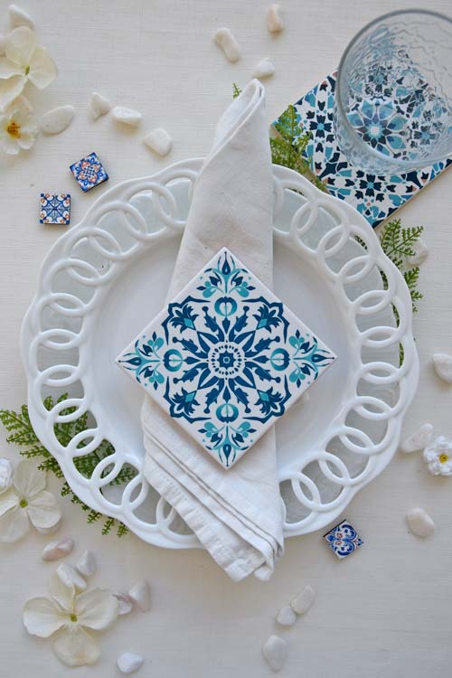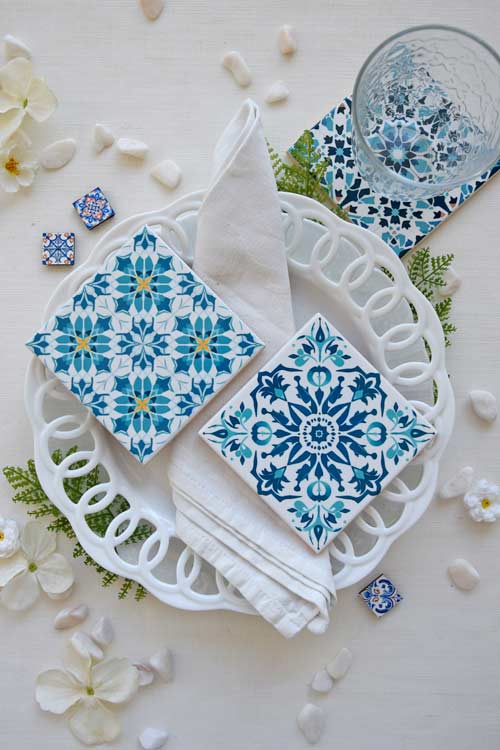 Transform your wedding table with the timeless beauty of these Portuguese-inspired tile coasters.