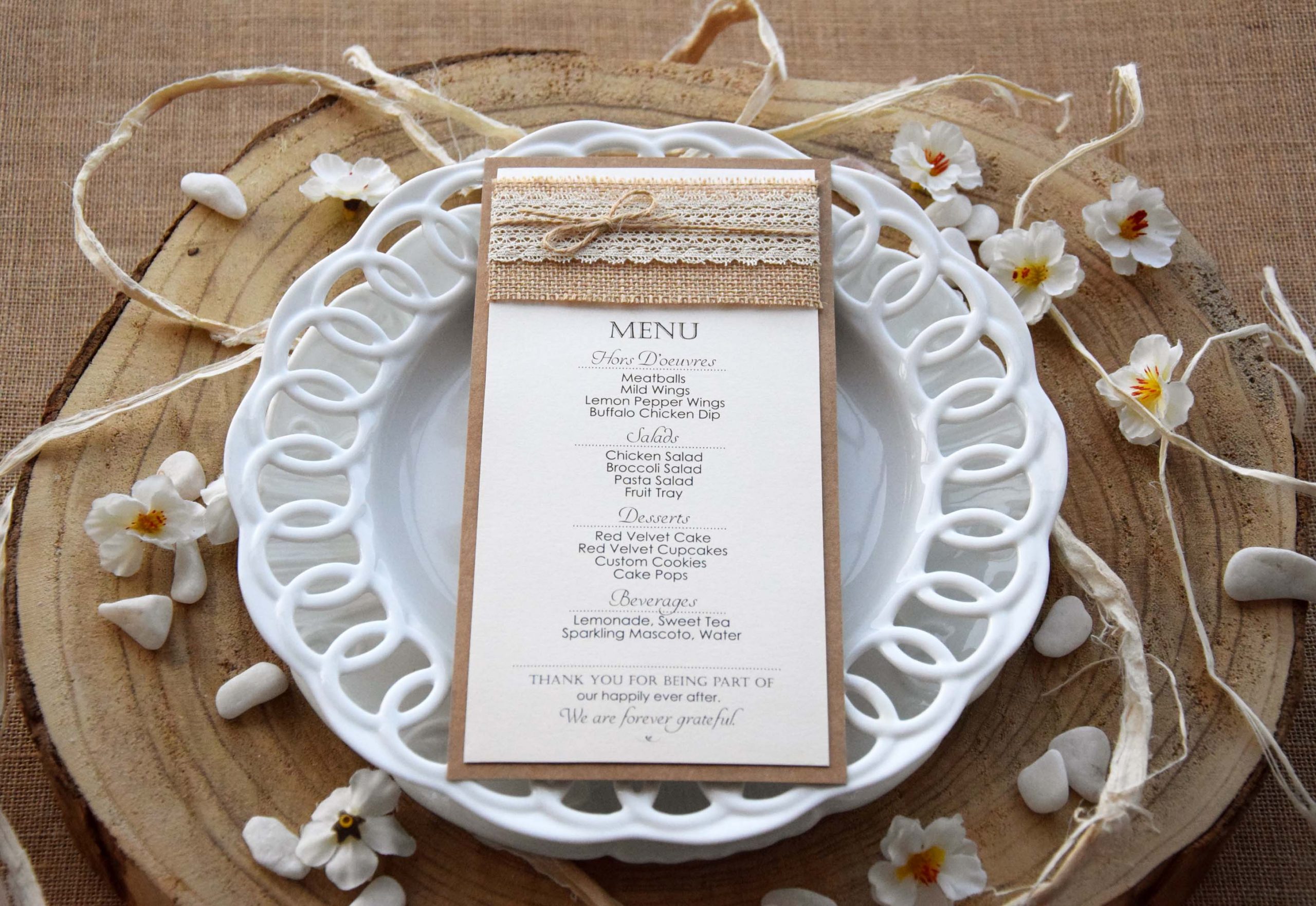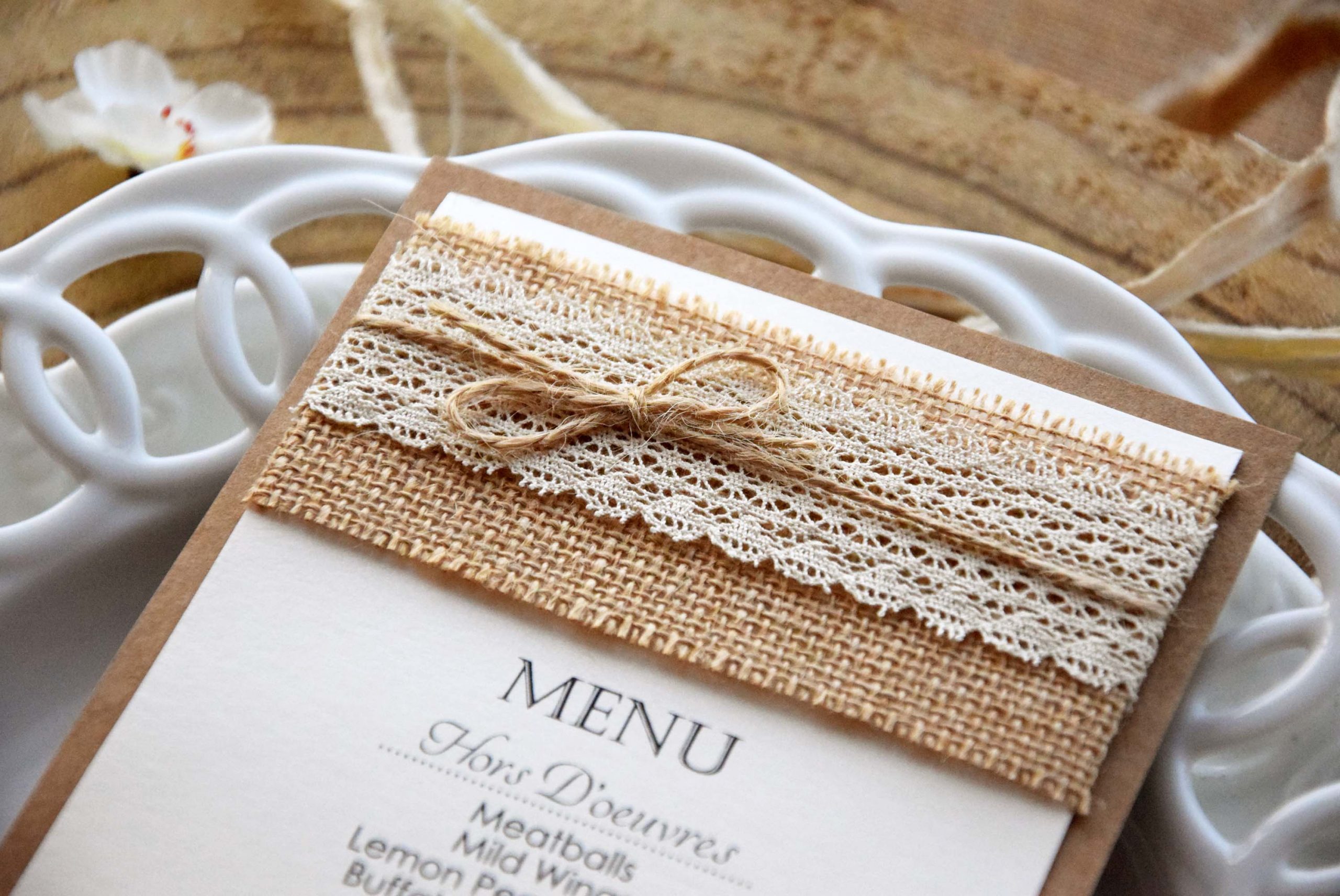 The menu is made in craft card stock on the back and ivory with shimmer to gives the perfect glam. In addition, the burlap, cream lace, and twine give the final touch. As a result, probably it’s perfect for rustic chic weddings and other occasions with burlap, lace, and country theme.