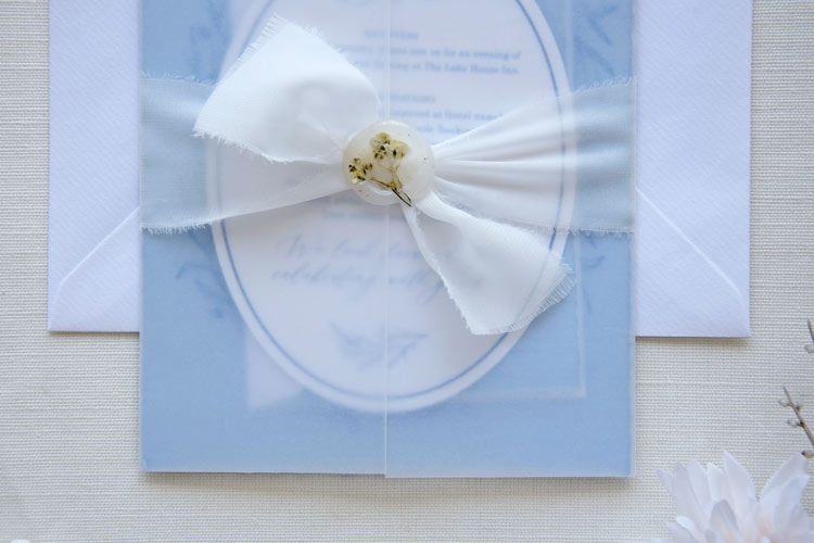- A translucent vellum, a sheer vellum wrap encloses the suite, tied with soft white chiffon ribbon and sealed with a handcrafted wax seal (from hot glue) featuring dried baby’s breath florals. It adds a romantic layer of texture and elegance to the presentation.