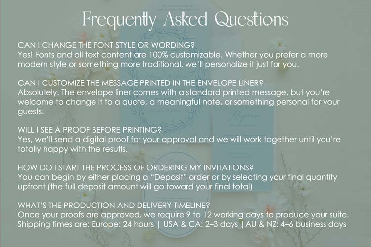 Questions? Please, visit this page (click here), where you’ll find detailed information, OR send us an email, OR book your free Clarity call. I can’t wait to meet you and create an unforgettable moment for you by creating your very own personalized wedding invitation.