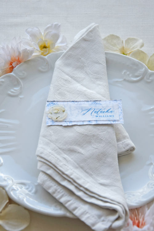 Soft, serene, and utterly romantic—this handcrafted place card is made from white, textured cotton, and deckled-edge paper and layered with translucent vellum, bringing a gentle sense of movement to your table setting.