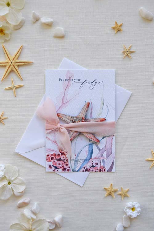 Featuring a watercolor starfish design over a backdrop of delicate coral, this magnet evokes the serene beauty of the ocean while hinting at the joy and excitement of your upcoming celebration.
