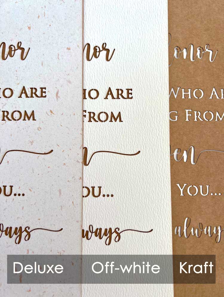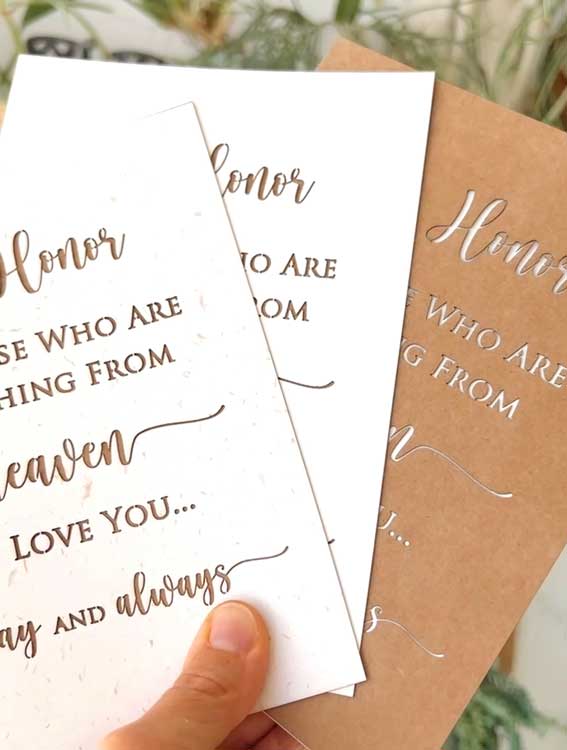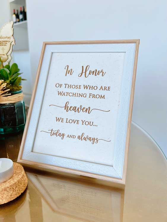 This simple memorial sign has laser-cut wording and will give you transparency to add a new sheet on the back to match your event style.