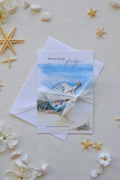 Invite your loved ones to embark on your love journey with our A Love in a Life – Message in a Bottle Save the Date Magnets.