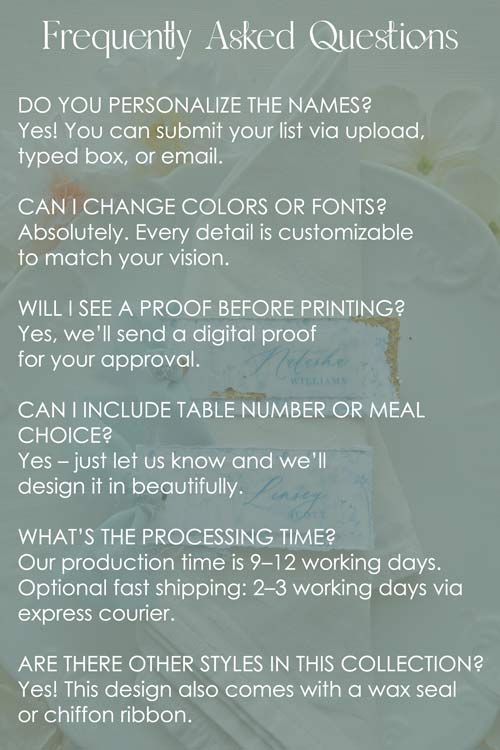- Colors can be personalized (ink, chiffon ribbon, and foil)