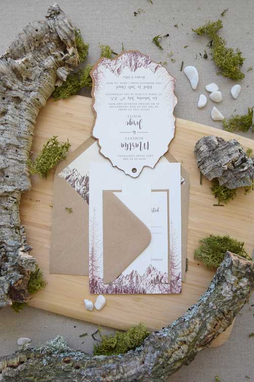 The cork appears in the second layer, which is inspired by the different sequences of plateaus that the mountainous areas allow us to see. It looks like a shadow and creates texture to the invitation.