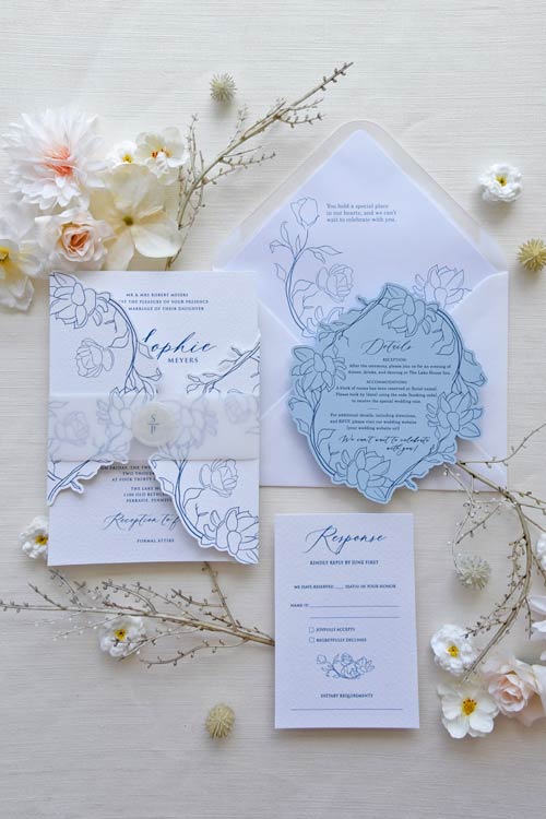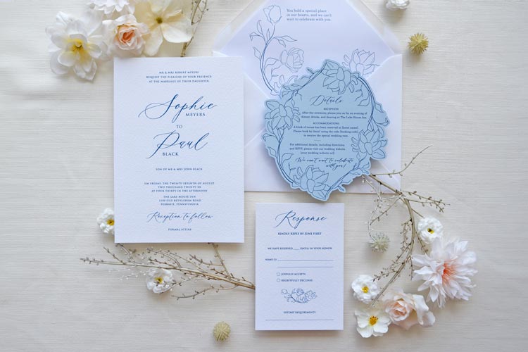 • Details card (optional – $1.5 usd fee for each) – a sculpted card in sky blue, printed in blue ink with additional wedding details. The floral frame shape makes this piece extra special — perfect for destination weddings, weekend itineraries, or accommodations.