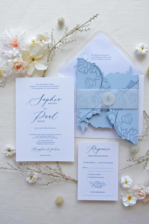 • Liner envelope – the invitation envelope features a floral-lined inner flap in sky blue color, with the message: “You hold a special place in our hearts, and we can’t wait to celebrate with you.” (it can be personalized).