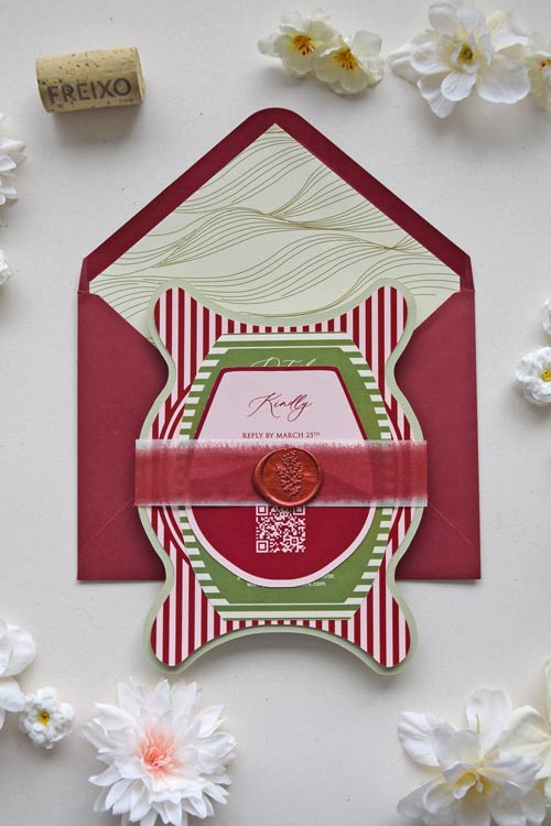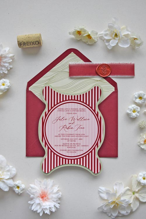 The invitation card and details card are inspired by the silhouette of a wine barrel, while the RSVP card echoes the shape of a glass of red wine.