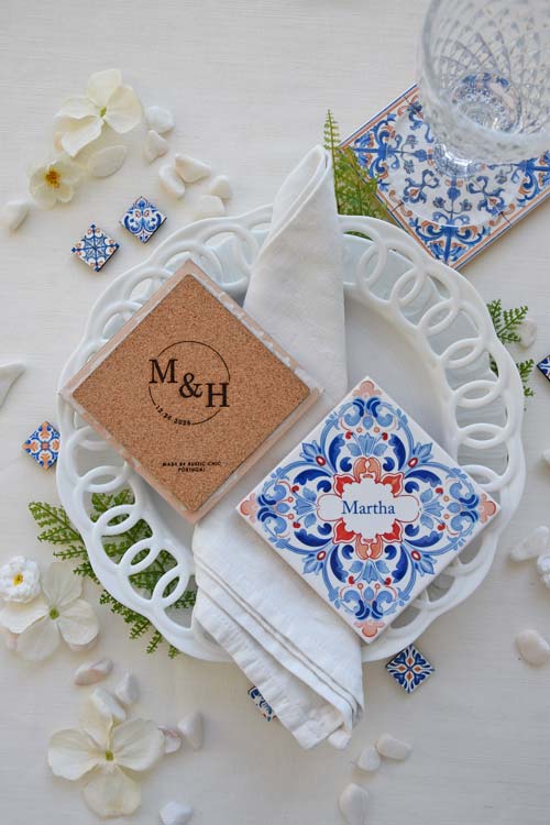 Elevate your wedding table with these exquisite blue and orange Portuguese-inspired tiles, personalized with each guest’s name.