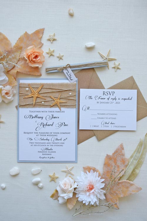 The perfectly laser-cut starfish, pearls, and burlap at the top of the invitation card give a minimalistic yet elegant vibe to the piece and will most definitely give your guests the sensation they are already on the big day as soon as they get it.