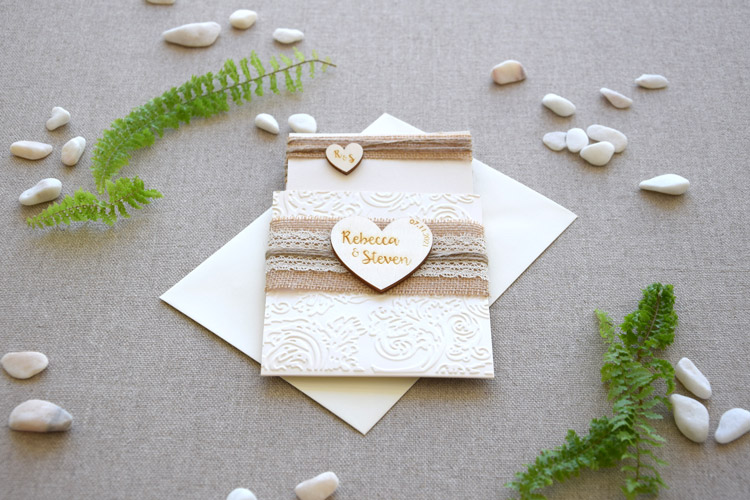 These Invitations are very beautiful because all design is very simple in addition to the natural burlap and cream lace on the belly band with a personalized wooden heart that is especially relevant to give the final rustic touch. As a result, probably it’s perfect for rustic weddings and another with rustic chic, country, or farm theme.