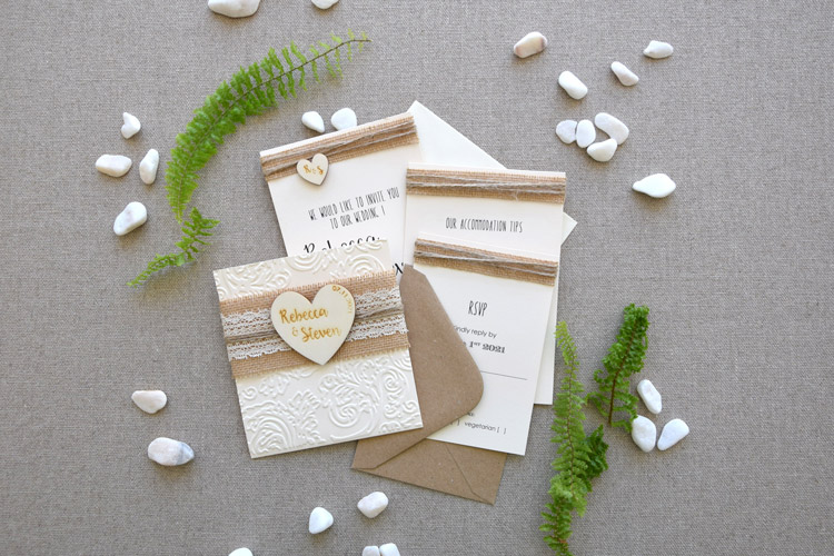 • Invitation card in ivory with shimmer, natural burlap, twine and wooden heart on the top