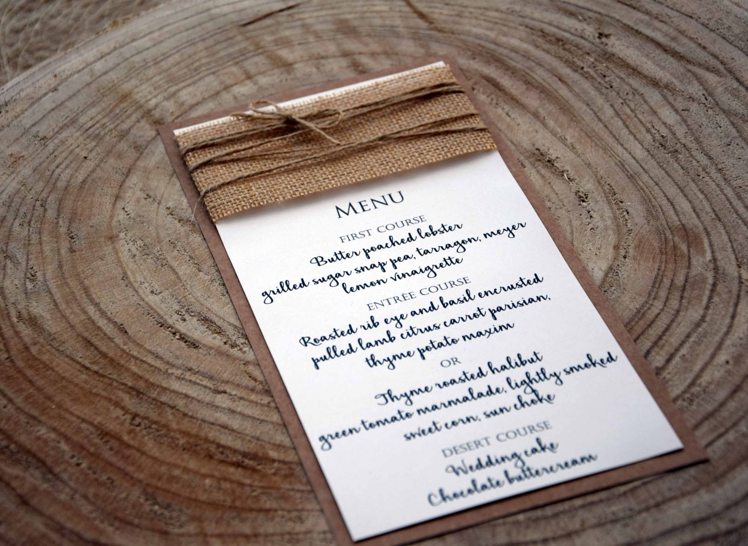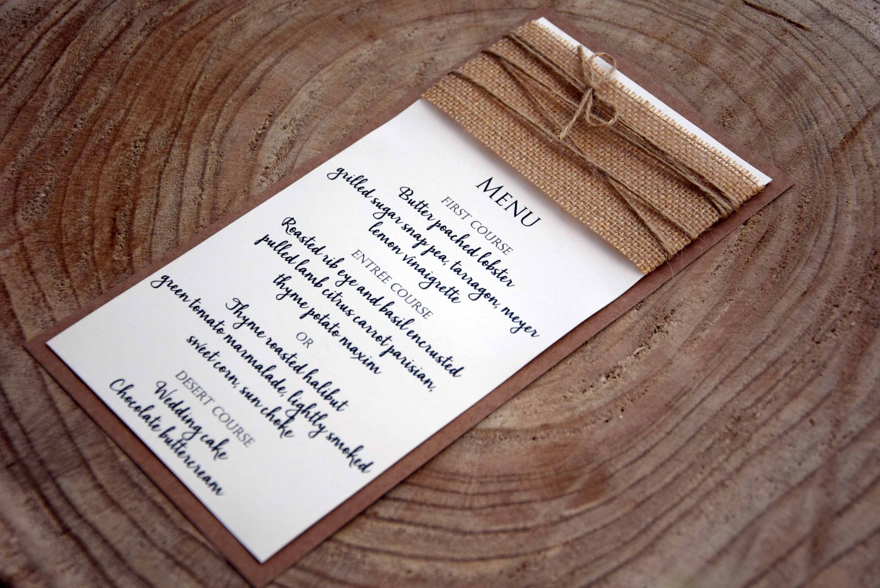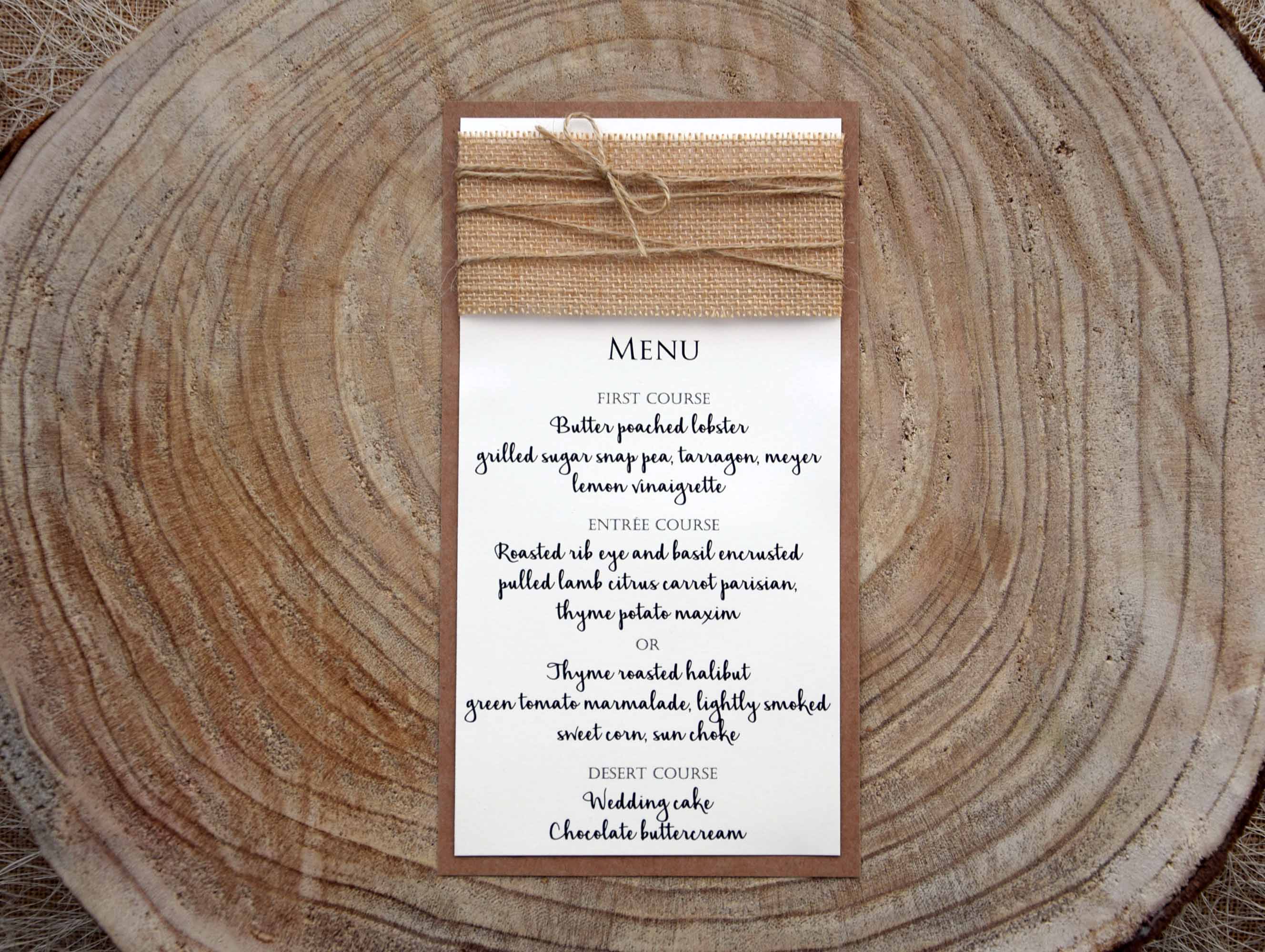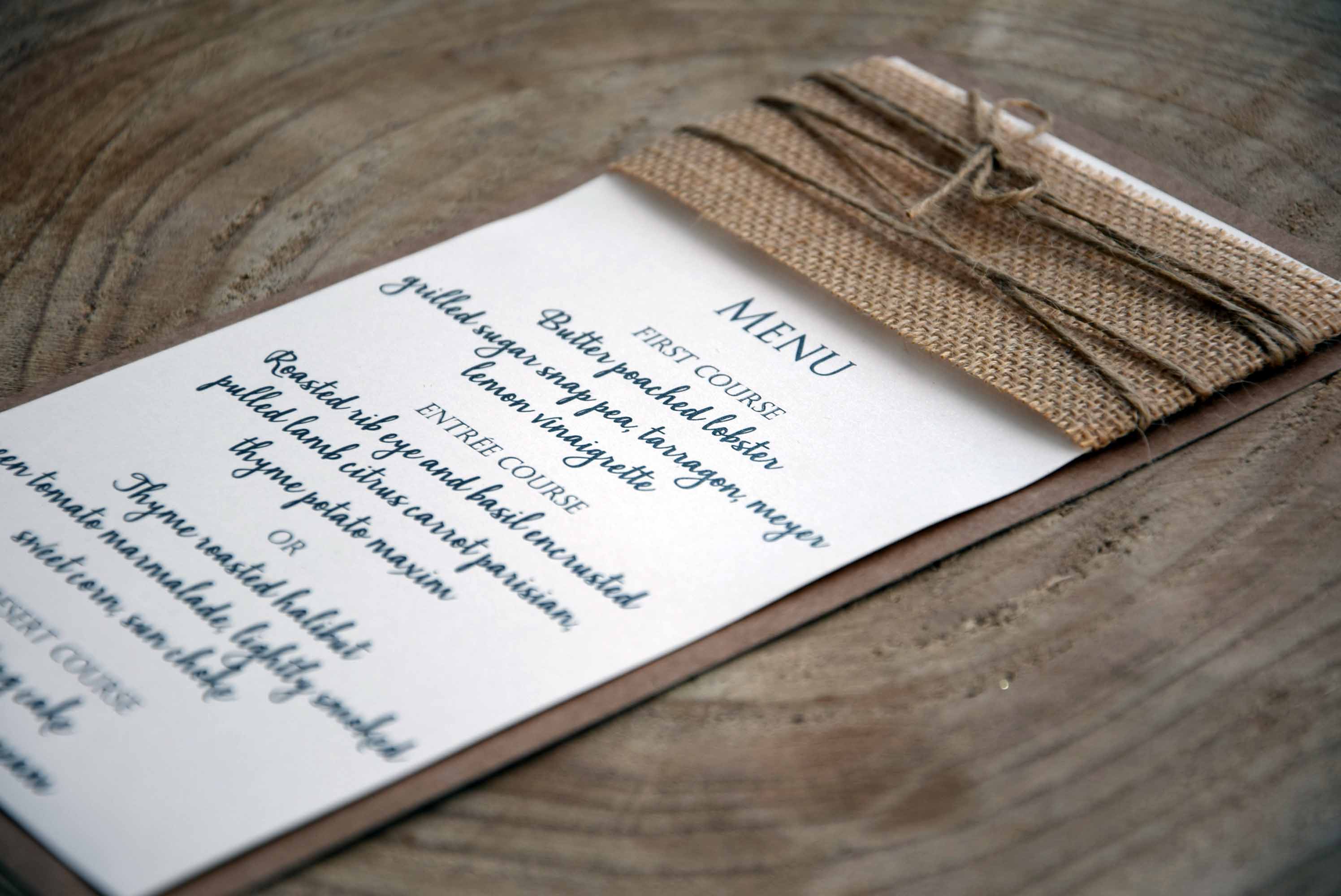 Rustic Simple Burlap Dinner Menu with simple details with burlap and twine that match with rustic wedding receptions, consequently it’s perfect for rustic weddings.