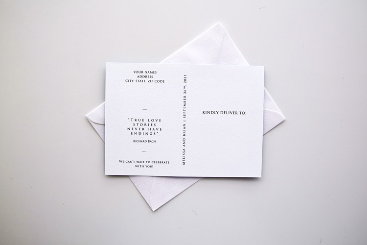 • Postcard: printed on the back (no envelope needed). Add the stamp and address and send it to your guest.