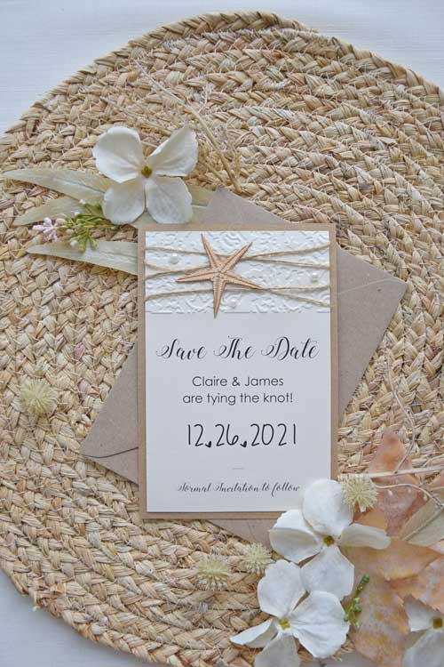 These Wedding Save The Date Cards are made of ivory cardstock with shimmer and adorned with a wooden starfish (created at our studio, by us), twine, and pearls for an elegant and modern look.