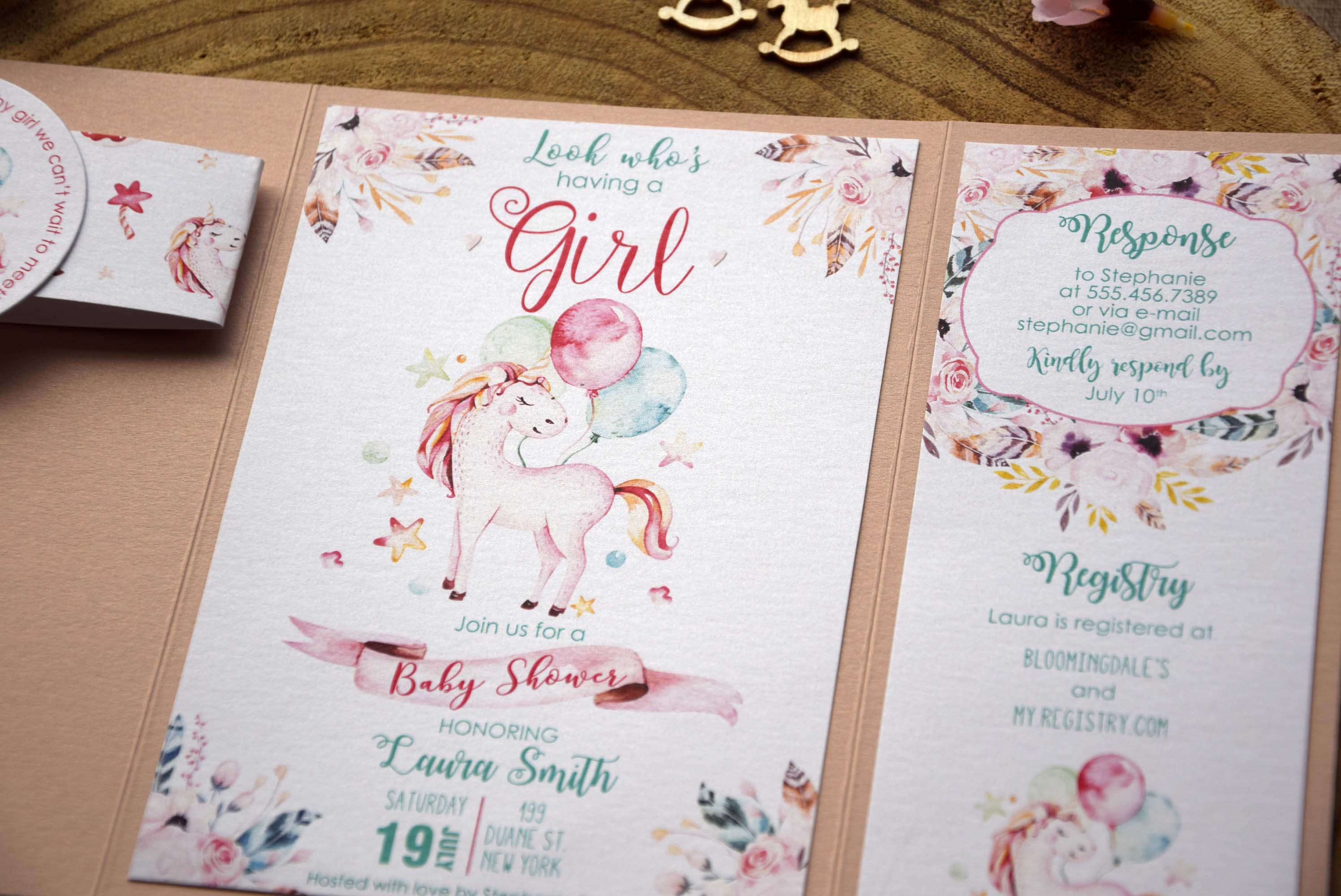 Celebrate the upcoming arrival of a new life with our baby shower invitation inspired by the meaning of unicorn symbolism.