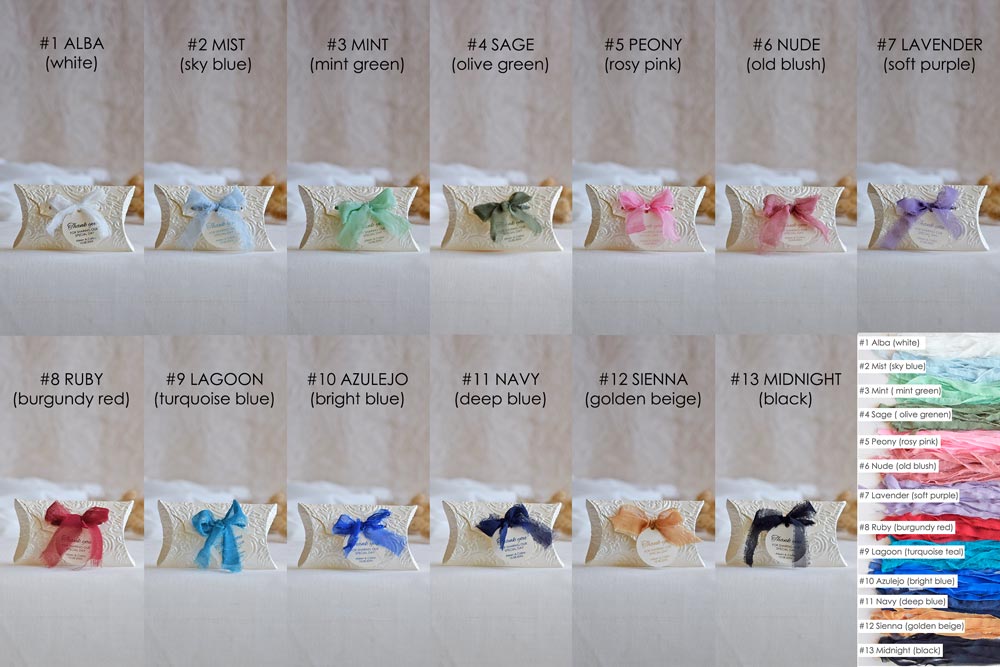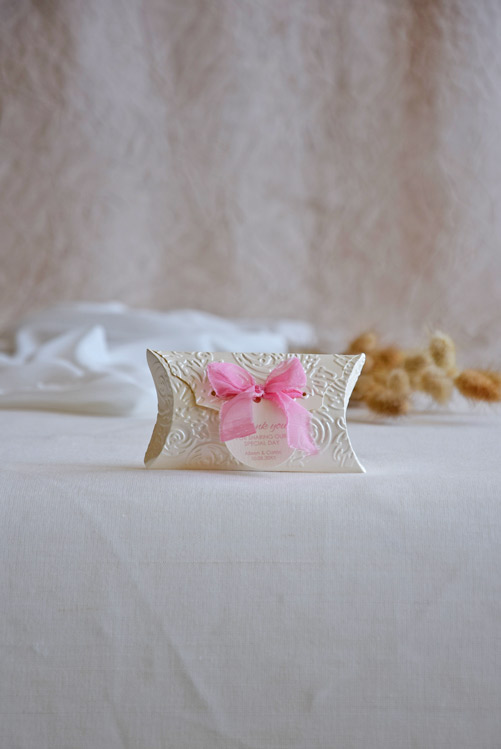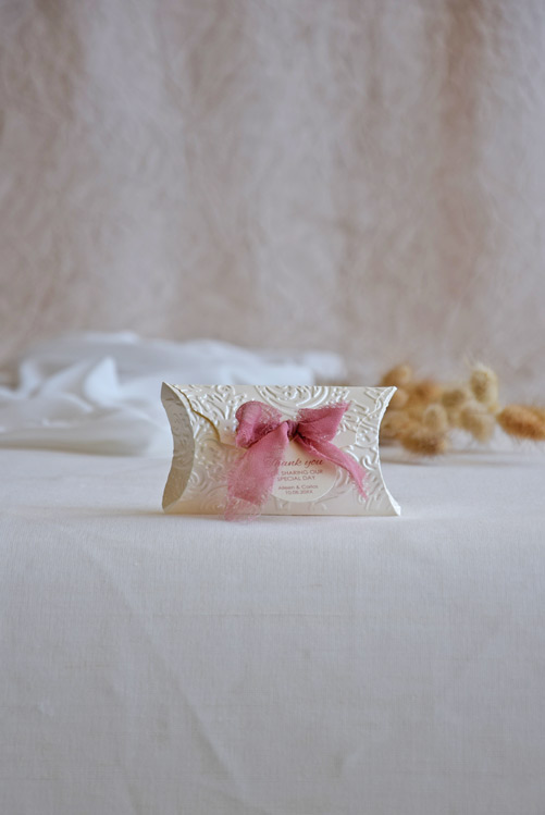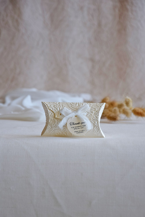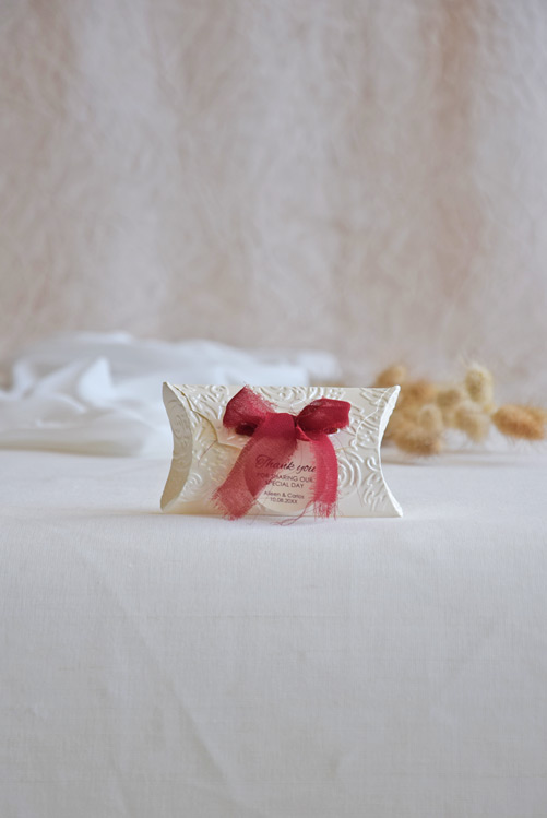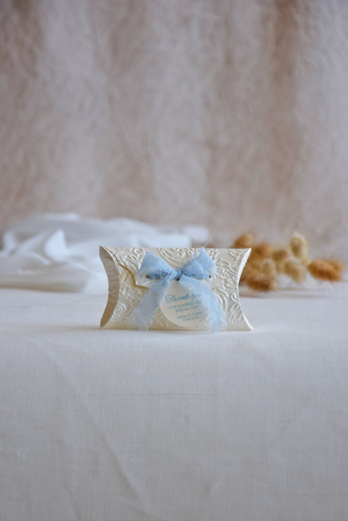 Embellished with your choice of chiffon ribbon and a round personalized tag, each box arrives ready to elevate your event with quiet elegance.