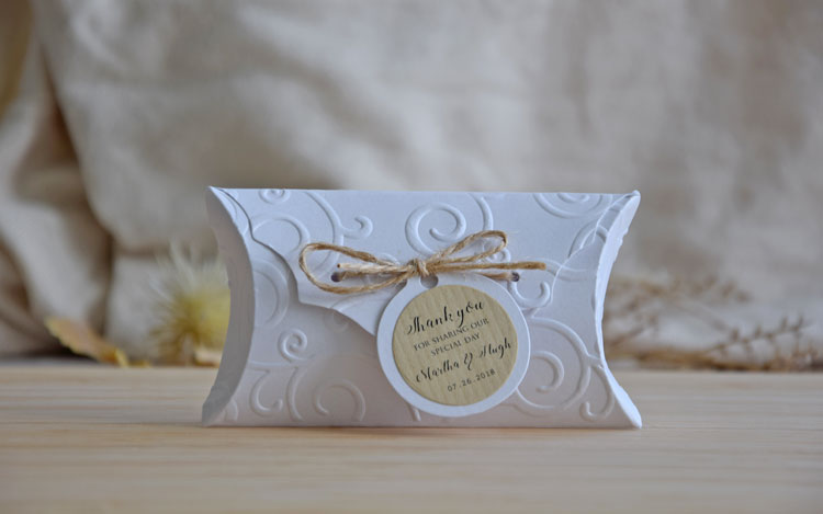 These favor boxes are made in white card stock with shimmer to give the perfect glam. In addition, pattern, round tag and personalized craft circle give the final touch. As a result, probably it’s perfect for weddings and other occasions with a country or rustic chic theme.