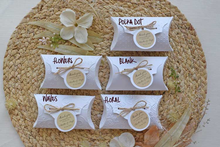 White Wedding Favor Pillow Boxes are made of white cardstock with shimmer and 5 patterns to choose the best to fit your style. These boxes are rustic, and consequently, are perfect for weddings, favor boxes/gift boxes, and other occasions that could match.